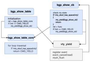 To support this asynchronous model, the team introduced several structural changes to the traversal logic within bgpd. These include a unified state structure to store traversal progress and references, a split between the initialization function and the repeatedly invoked executor, a new CMD_YIELD state to indicate suspension due to buffer limits, and a chunk_used field to track real-time buffer usage. The overall process becomes event-driven, allowing traversal to pause and resume safely while maintaining correct state and reference management.